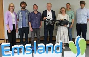 Bild: Gemeinsam mit Erstem Kreisrat Martin Gerenkamp (4. v. l.) und Karin Prein (l.) vom Sponsor Sparkasse Emsland gab die Jury der Emsland Filmklappe mit (v. l.) Dominic Fähning vom Landkreis Emsland, Tobias Mielke vom Centralkino in Lingen, Juryvorsitzende Christina Almandoz, Astrid Muckli von den Kinobetrieben Muckli und Ragnar Wilke vom Jugendzentrum Papenburg den Startschuss für die nächste Runde des Filmwettbewerbs. (Foto: Landkreis Emsland)