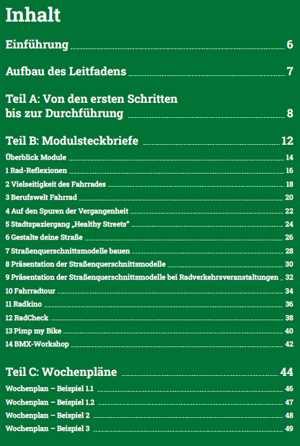 Im Rahmen einer Projektwoche, einzelnen Projekttagen, in Arbeitsgemeinschaften oder punktuell im Unterricht können 14 Module zum Thema Radverkehr und nachhaltige Mobilität etabliert werden. Neben ersten hilfreichen Schritten enthält dieser Leitfaden 14 Modulsteckbriefe, Beispielwochenpläne, kopierbare Arbeitsblätter, Elternbriefe, Checklisten sowie Power-Point-Vorlagen und unterstützt somit eine praxisnahe Mobilitätsbildung ab der 5. Klasse.